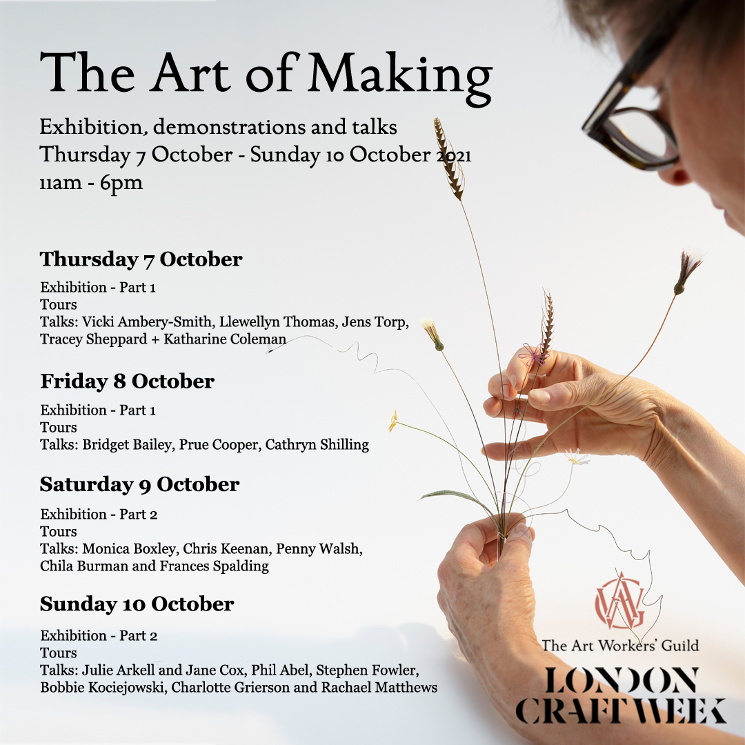 11.30 am. Bridget talks about interpreting nature in her work, from the awe-inspiring construction of a blade of grass to how to describe a dead butterfly in the language of textiles. The exhibitions are free but the talks cost £12 and can be booked hereThe Art Workers’ Guild; a beautiful building in the heart of Bloomsbury that hosts The Art Workers’ a body of artists, craftspeople and architects working at the highest levels of excellence in their professions. Founded in 1884, its principle of ‘learning by doing’ has spread through arts education worldwide. A respect for craftsmanship and recognition of the value of craftsmanship still characterises the Guild.