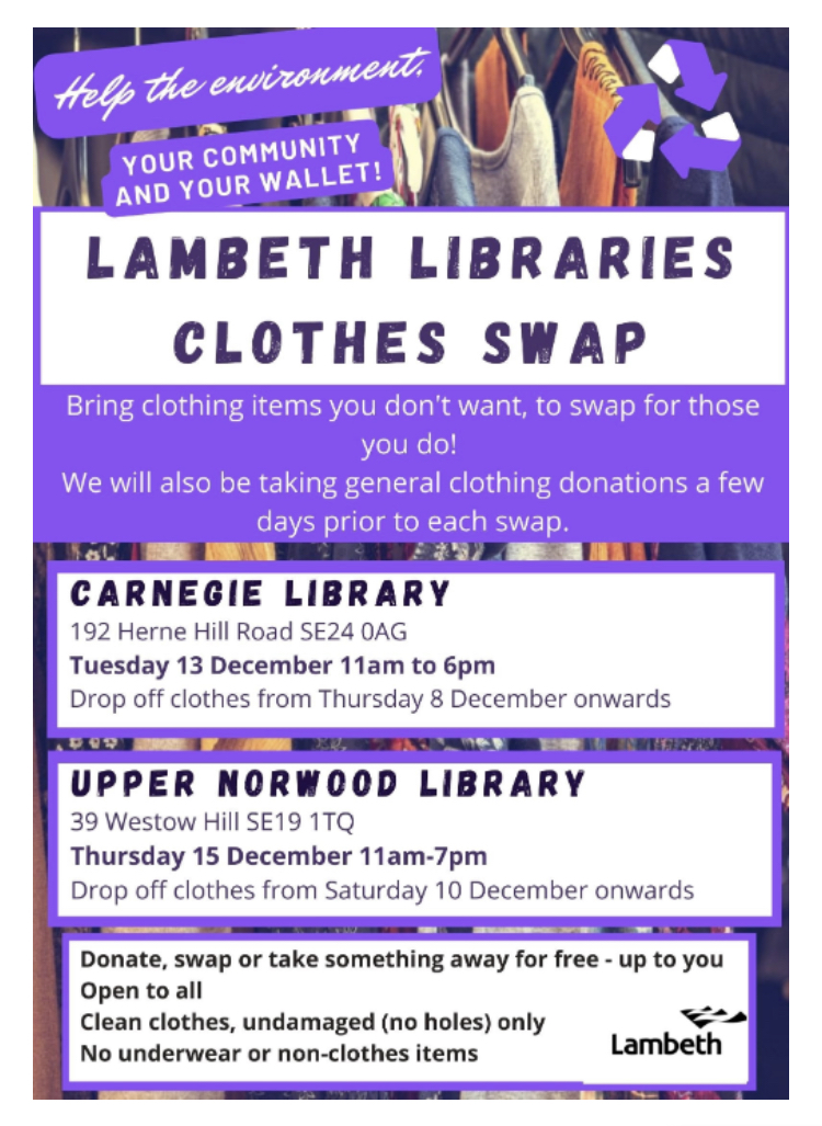 Donates, swap or take away for free! Carnegie will be accepting clothes drop offs from Thursday 8 December onwards. If you have time and would like to volunteer your services before or at the event, please email infor@carnegiecommunitytrust.org.uk