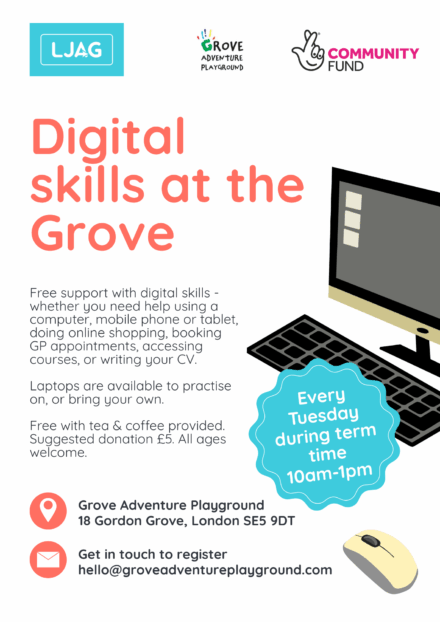 We’re offering free support with digital skills at Grove Adventure Playground on Tuesdays during term time, 10am-1pm. Whether you need help using a computer, mobile phone or tablet, doing online shopping, booking GP appointments, accessing courses, or writing your CV, we’re happy to help.