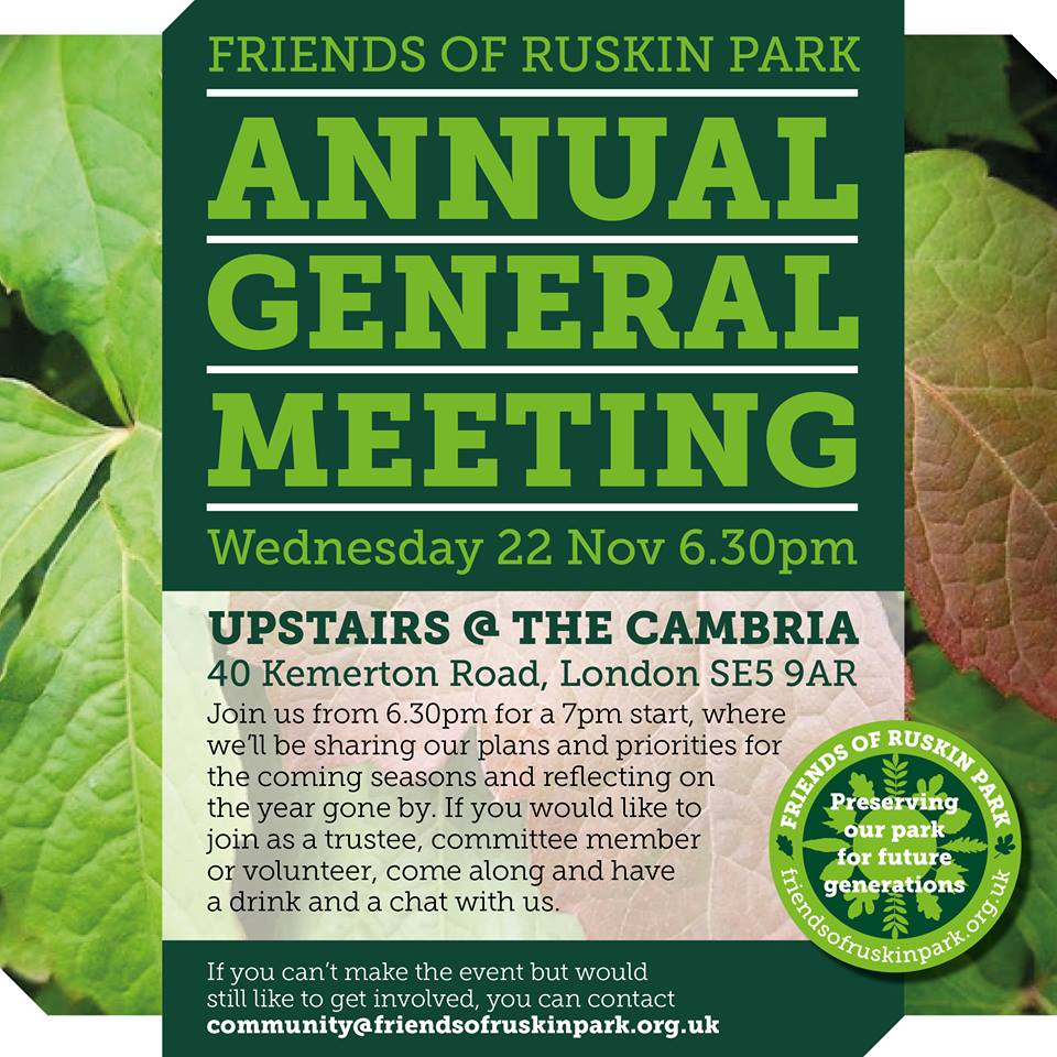 Friends of Ruskin Park Annual General Meeting Upstairs at The Cambria