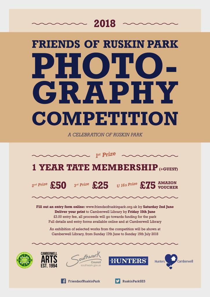 Building on its success in previous years we are delighted to launch our Photography Competition for 2018. This is a project led by Friends of Ruskin Park volunteers in partnership with Camberwell Arts and Hunters with an exhibition of entries at Camberwell Library. Full details are below, or click here to make your entry.