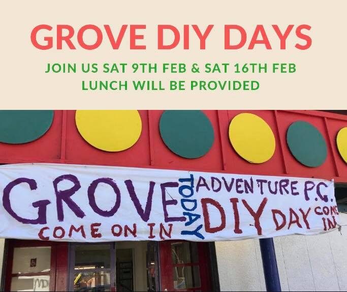 Volunteers and staff at Grove Adventure Playground will be holding some DIY days at the Grove SAT 9th FEB and SAT 16th FEB . All welcome. Whether it’s painting, pulling weeds out, sanding, there will be a job for you! So please put this in your diary, all help is greatly appreciated