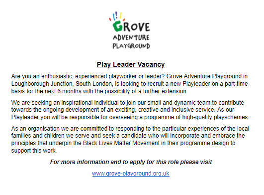 Grove Adventure Playground – Play Leader Vacancy