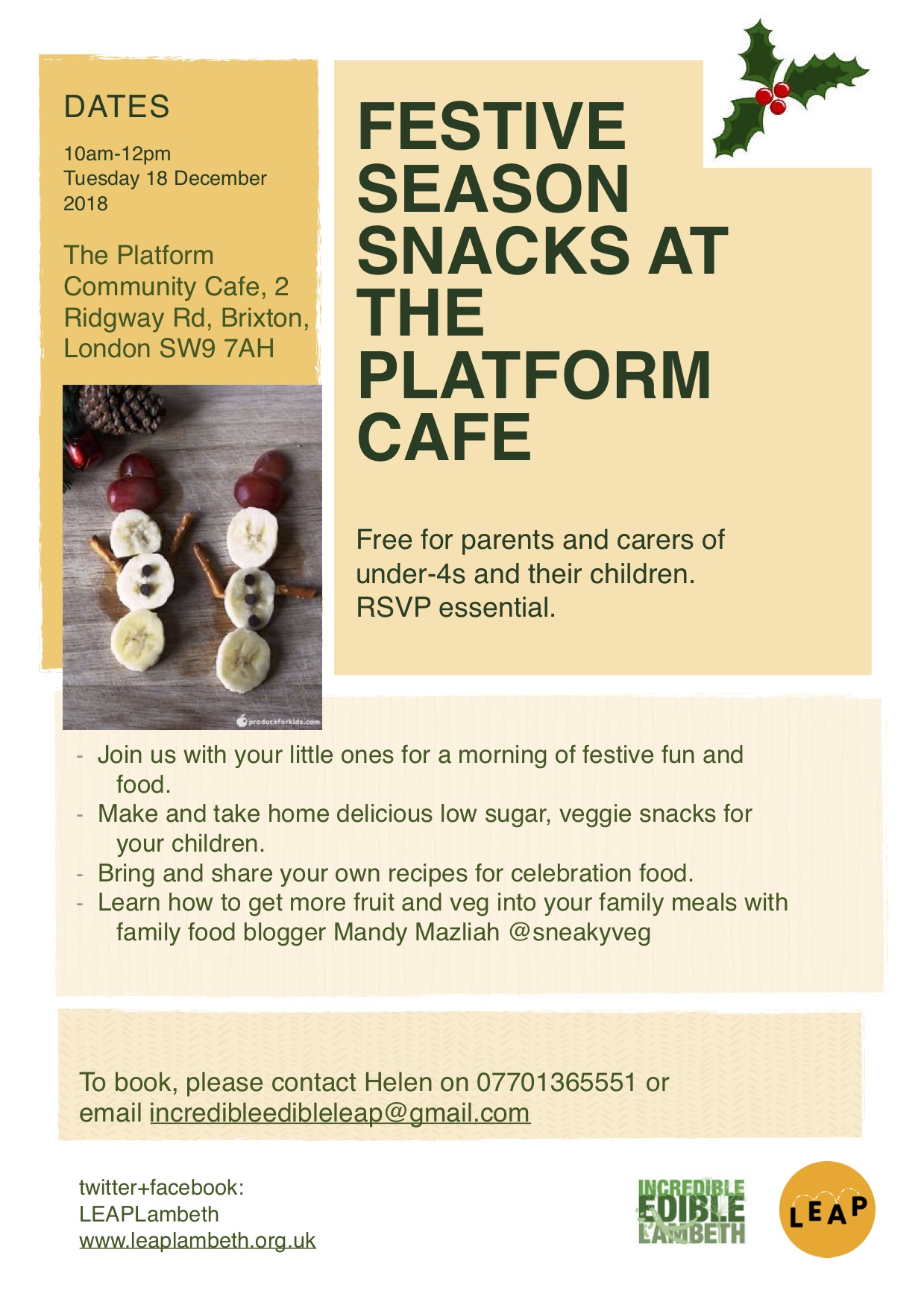 5 Latest news 5 Incredible Edible LEAP Festive Season Snacks at the Platform, SW9 Tuesday 18 December 2018