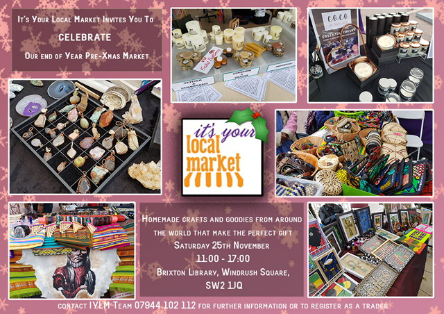 It’s Your Local Market host and Tate Library, Brixton Pre-Xmas Handmade and arts & Crafts Traders market. We have opportunities for local people to trade, exhibit and display their handmade wears. Stalls available first time business start up for £15.00
