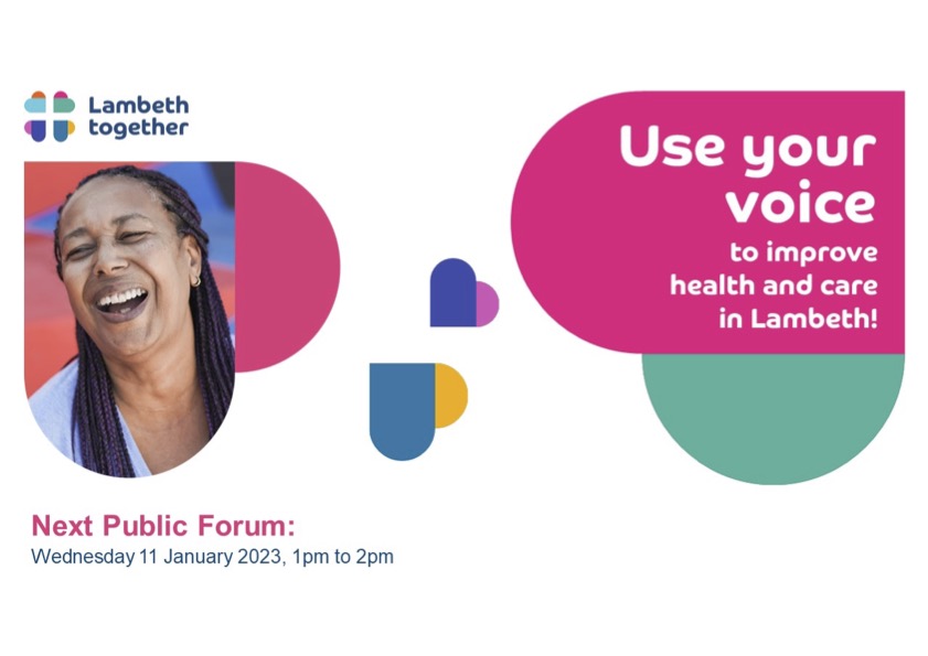 The next Lambeth Together Public Forum is online on Wednesday 11 January from 1-2pm. This is an open space for local communities to meet decision-makers, ask questions and raise important issues with the leaders of Lambeth’s health and care system. There’s no agenda and people do not need to sign up to participate.