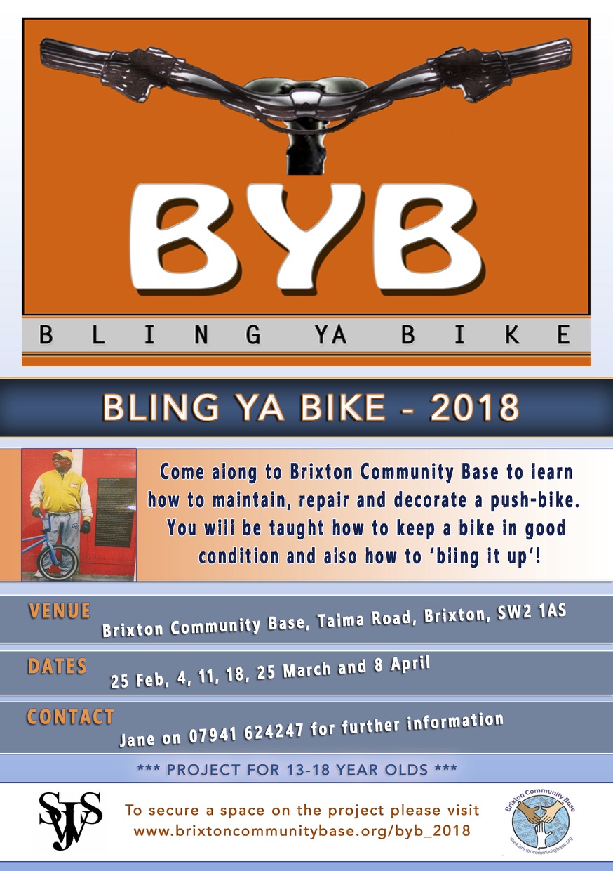 The next ‘Bling Ya Bike’ project will be running 3, 4, and 5 April, 1-4pm at Brixton Community Base. The project is for 13-18 yr-olds from the Brixton/Lambeth area.