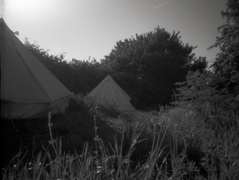 Image: Exp 8 View from pot 2.5s 144* at 08.33, Sunday 4 May 2014, Soundcamp, Stave Hill Ecological Park, London 2 May 2015. Pinhole Zero 612b Kodak 100Tmax by